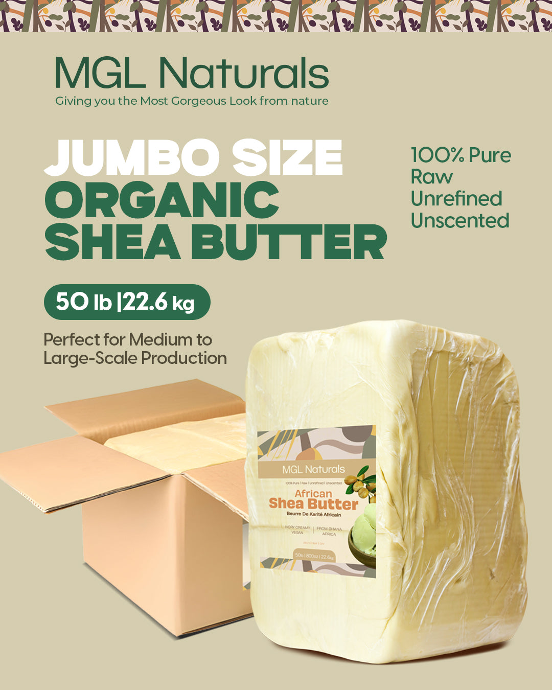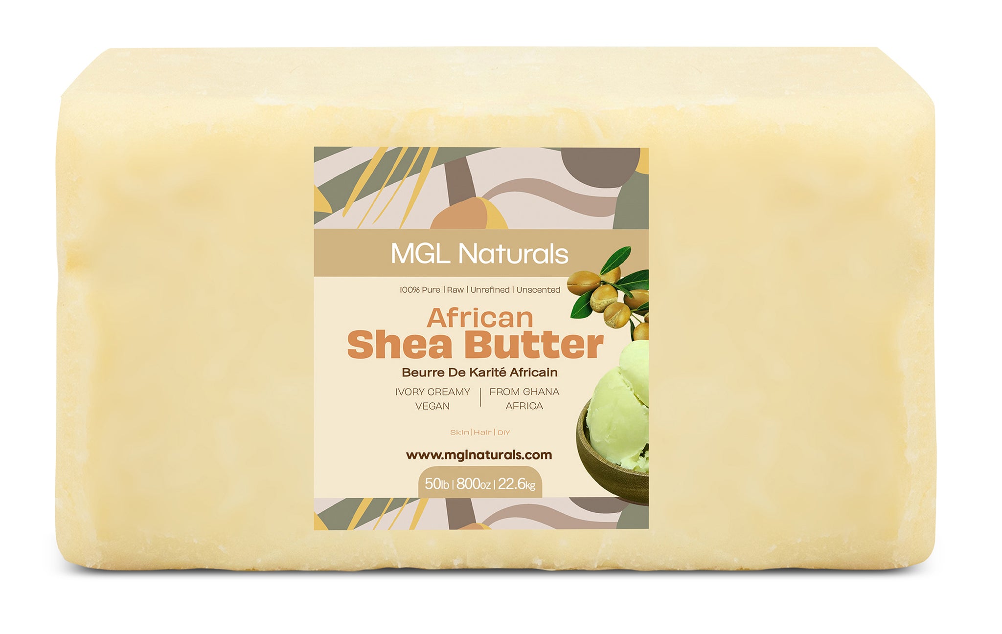 MGL Naturals unrefined African Shea Butter is an all-natural handcrafted intensive daily moisturizer for the skin and hair. Sustainably sourced in Ghana, West Africa, from determined rural women whose livelihood is improved because you purchased this product fairly. It deeply nourishes, protects, restores, and enhances the hair, skin, face, lips, hands, feet, and for massage. Known for its properties, it contains vitamins A, E and F. For all skin and hair types.